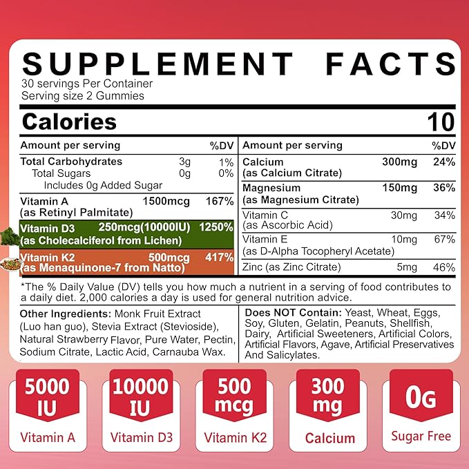 - 【Great Value Vitamin D3 K2 A + Calcium & Magnesium Formula Blend】Ellamentz Vitamin D3K2 Gummies contain Vitamin A 1500mcg, Vitamin D3 10000IU, Vitamin K2(MK4, MK7) 600mcg with Calcium and Magnesium, Vitamin C, E, Lutein that work together to help enhance calcium regulation, deliver immune support & joint health, keep Energy, it is packed in tasty and easy-to-swallow pectin gummies for maximum absorption and can be an excellent addition to your daily regimen!