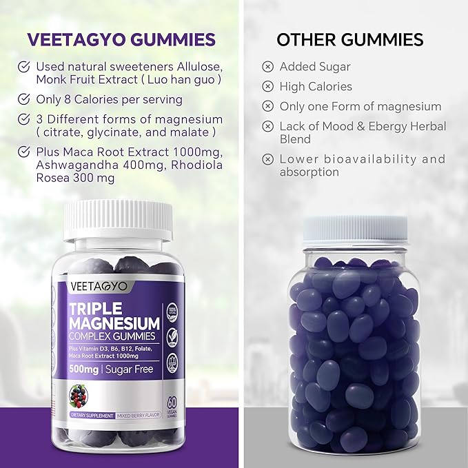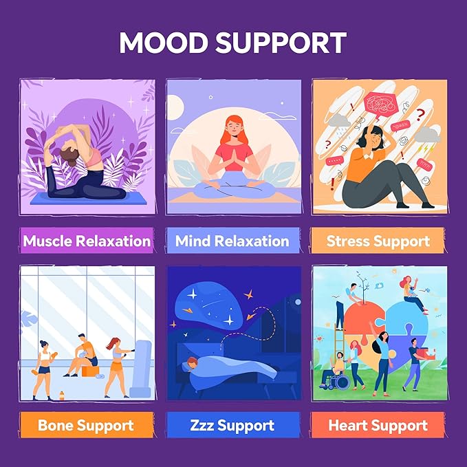 - 【Target multiple aspects of overall health and well-being】 Tri-Magnesium Complex (Magnesium Taurate, Magnesium Glycinate, Magnesium Malate), a blend of different forms of magnesium known for their potential to support relaxation, reduce stress, and enhance energy production.Vitamin D3, Vitamin B6, Vitamin B12, and Folate, essential nutrients that play a crucial role in neurotransmitter synthesis, energy metabolism, and overall feeling regulation.Feeling & Energy Boosting Complex, including Maca Root Extract, Ashwagandha Extract, and Rhodiola Rosea Extract, known for their potential to enhance feeling , reduce fatigue, and support overall energy levels.