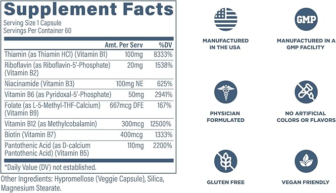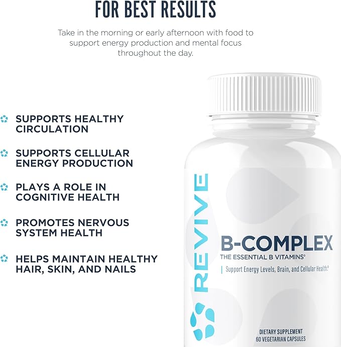 - Improve Fatigue & Brain Function: All-natural B-Complex from ReviveMD is designed to boost energy levels, support cognitive health, and promote healthy skin, while also supporting the immune system. Each capsule is packed with essential B-vitamins that work together to help you feel your best. 60 vegetarian capsules.