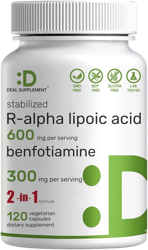 DEAL SUPPLEMENT R Alpha Lipoic Acid 600mg with Benfotiamine 300mg Per Serving, 120 Veggie Capsules – 200mg R-ALA Per Capsule – Antioxidant Supplement for Energy & Nervous System Support
