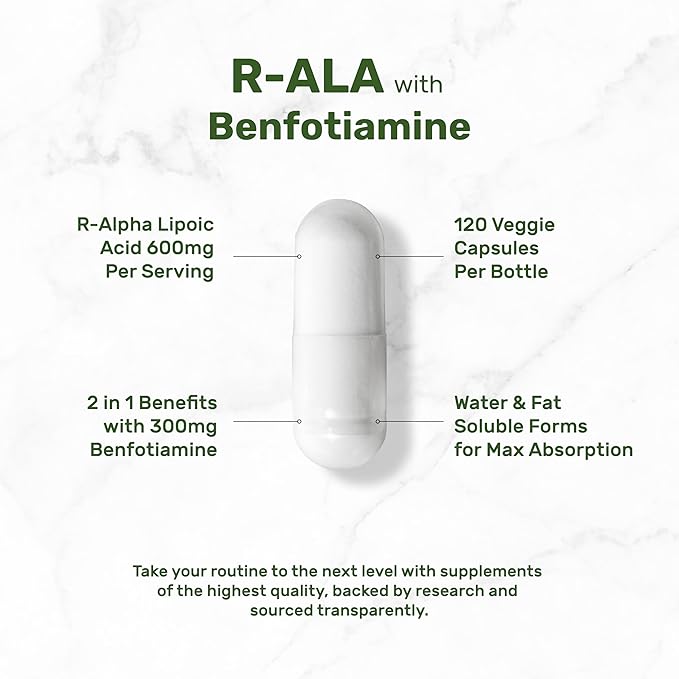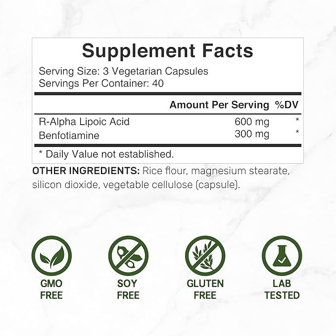 - Dosage & Servings – 120 vegetable capsules per bottle with 3 veg capsules per serving, contains 600mg R-ALA with 300mg Benfotiamine per dose, up to a 40-day supply.