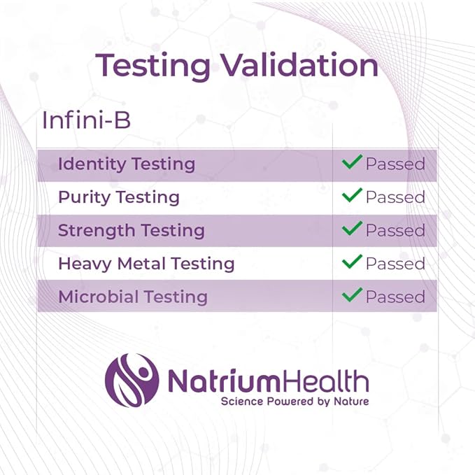 - Full Spectrum B-Vitamin Complex: Infini-B encompasses all eight essential B vitamins, B1 (Thiamine), B2 (Riboflavin), B3 (Niacin), B5 (Pantothenic Acid), B6, B7 (Biotin), B9 (Folate), and B12. This ensures a broad range of benefits, from energy production to cognitive enhancement, without any compromises.
