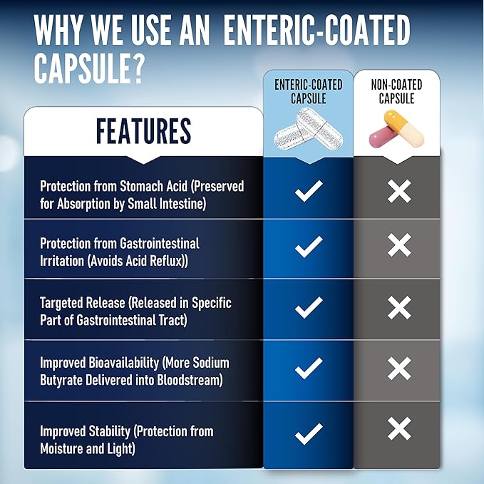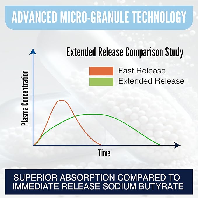 - EXTENDED RELEASE MICRO-GRANULE FORMULA: Designed with advanced micro-encapsulation technology, each 300mg butyrate acid capsule delivers sodium butyrate directly to the lower gastrointestinal tract, maximizing absorption where it counts.