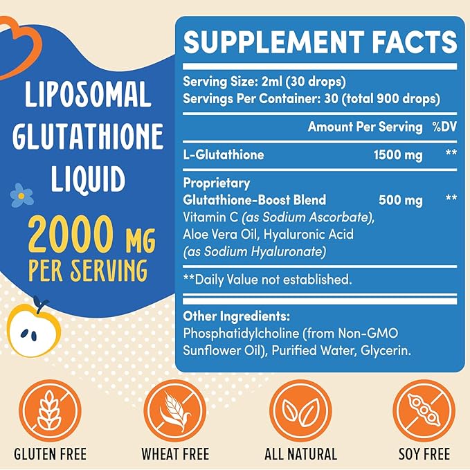 - Potent Formulation, A True Antioxidant Boost - Each drop of our liposomal glutathione supplement is a powerhouse of health-boosting ingredients. Total 2000 mg contains 1500 mg of L-Glutathione combined with the synergistic benefits of Vitamin C, Aloe Vera Oil, and Hyaluronic Acid, you're not just getting a supplement. This comprehensive blend provides a powerful antioxidant that helps to eliminate free radicals and protect your cell from damage.
