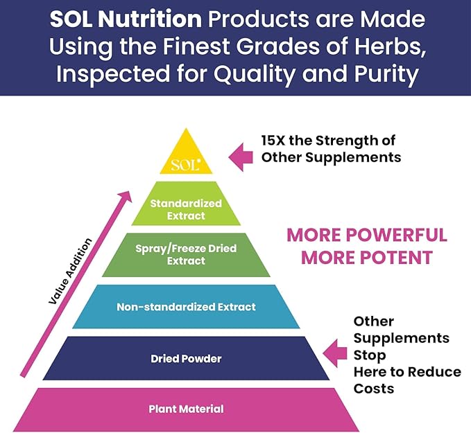 - CONCENTRATED HERBAL EXTRACT – SOL Nutrition uses a proprietary herbal extraction process which results in faster absorption. Our herbal extract delivers 15 times the potency of competitive products.