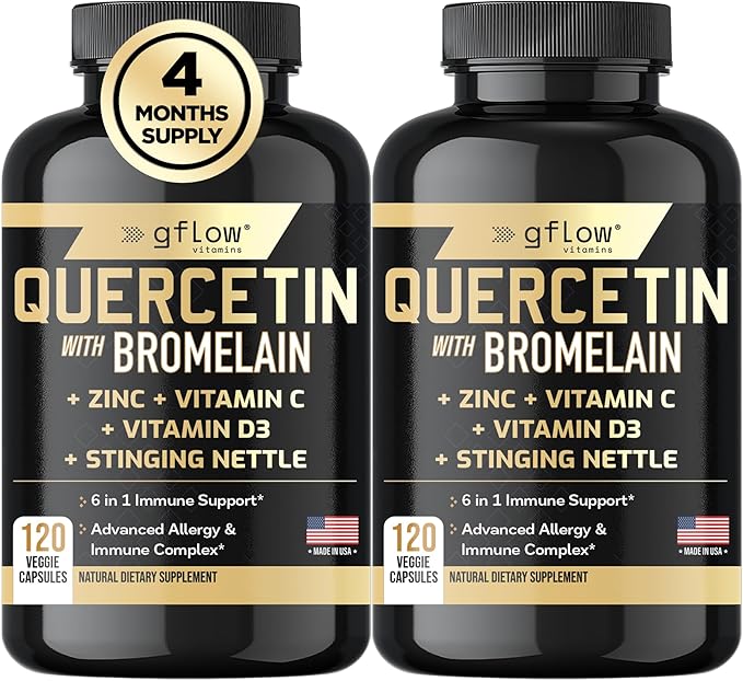- A POWERFUL COMBINATION TO BOOST THE IMMUNE SYSTEM: Quercetin is a plant pigment naturally found in fruits and vegetables. Gflow Quercetin with Bromelain has also vitamin C, Zinc, and Vitamin D3, as well as stinging nettle root. Stinging nettle capsules work together with the other ingredients to help the body absorb the quercetin more effectively. It's a great substitute for quercetin powder, bromelain powder, and zinc supplements