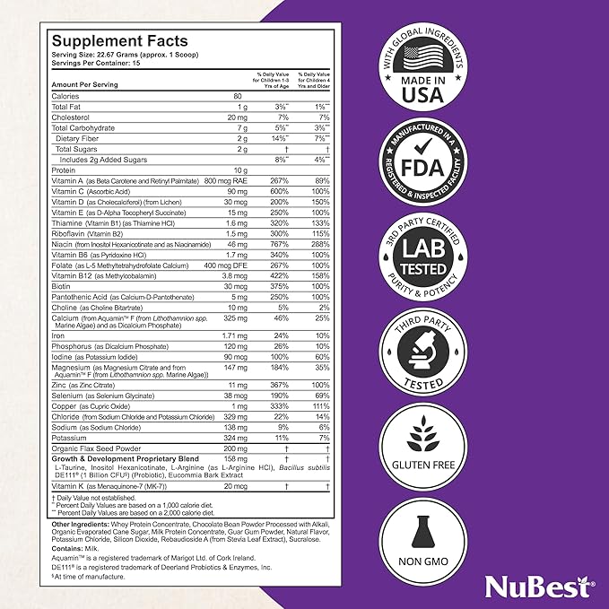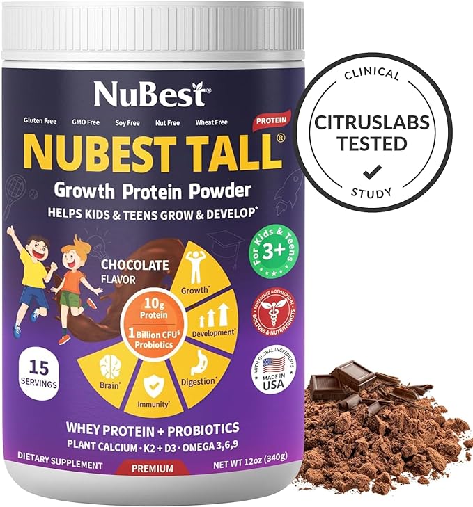 NuBest Tall Protein Powder for Kids & Teens - Whey Protein Powder - Chocolate Protein Powder Shake with Probiotics, Omega 3-6-9, Vitamin D3 + K2, Calcium, Vitamin - 15 Servings | 2 Week Supply