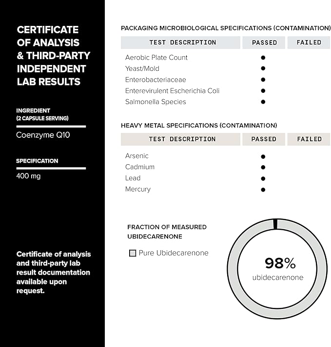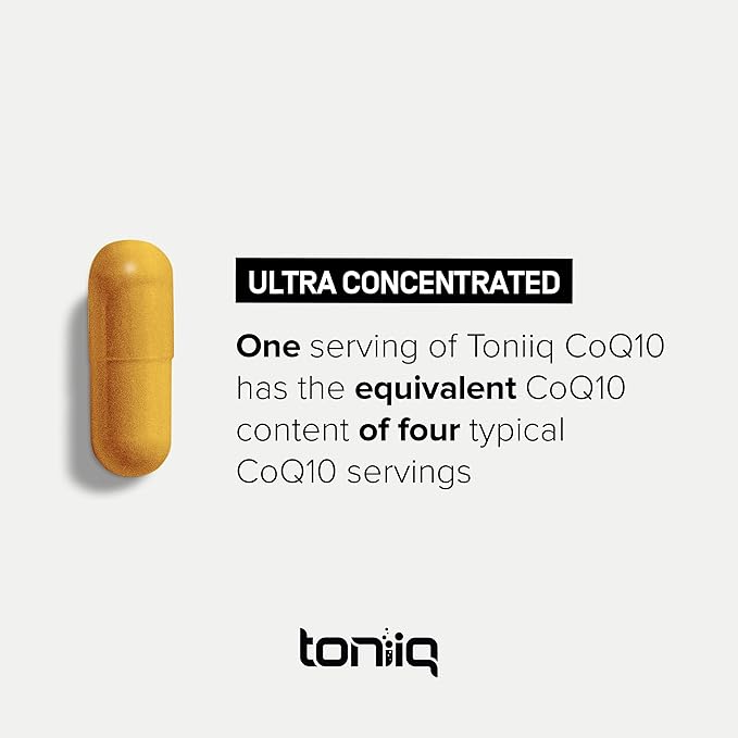 - The Highly Purified Form of CoQ10 - Toniiq CoQ10 Capsules contain 400mg of the highest quality Coenzyme Q10 powder in each serving– crafted to ensure 98% standardized purity (other co q 10 supplement products won’t disclose their purity levels).