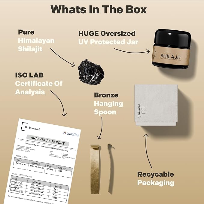 - Non-Chemical Extraction – 3rd Party Tested by a world-leading laboratory. Free from heavy metals, fillers, and contaminants and packaged in a UV-protected jar. Essencraft Shilajit sets the benchmark for shilajit supplements