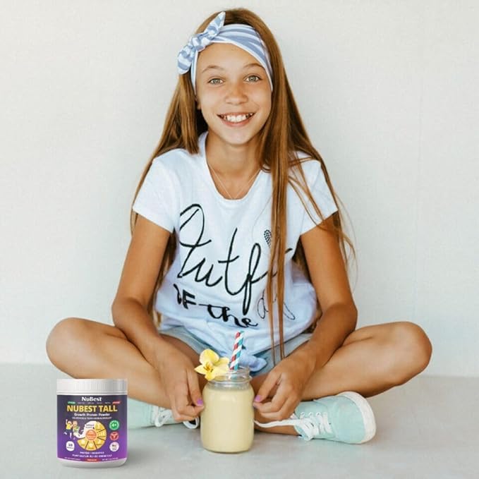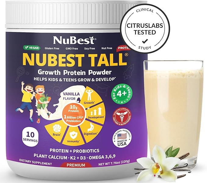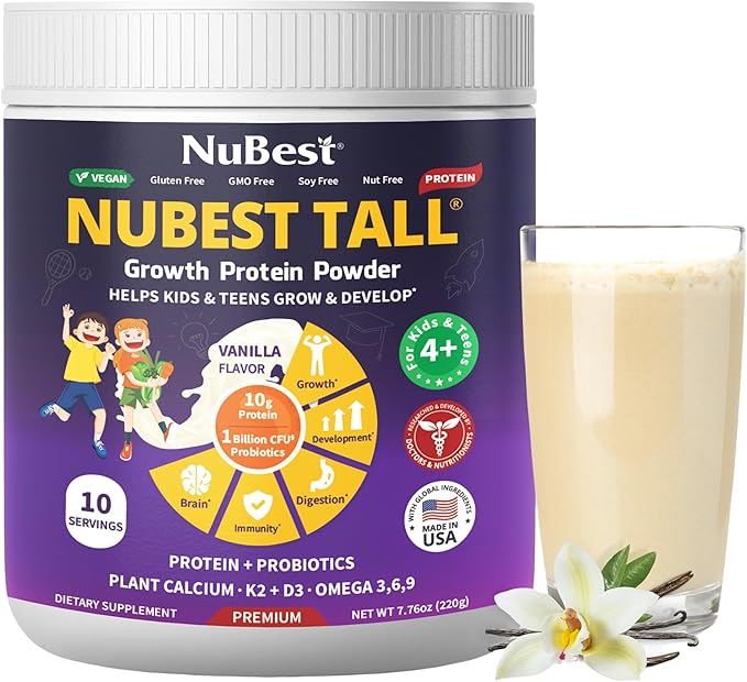 NuBest Tall Vanilla Plant-Based Protein Powder for Kids & Teens - Healthy & Immunity with Probiotics, Omega 3-6-9, Vitamin D3 + K2, Calcium & Vitamins - 10 Servings | 2 Week Supply
