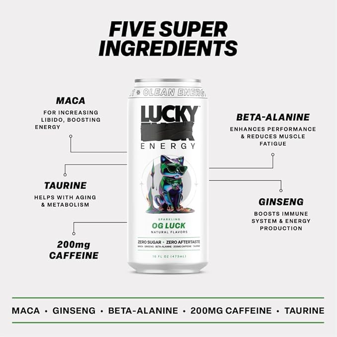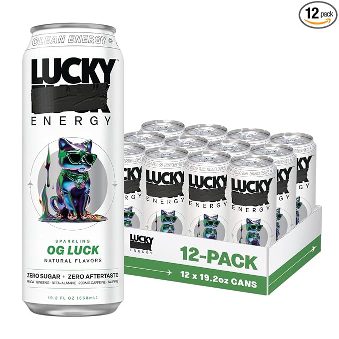 Lucky Energy Sugar Free Energy Drinks 19.2 Fl Oz Cans (Pack of 12) Healthy Energy Drink. OG Luck with Maca, Ginseng, Taurine, Beta-Alanine, 200mg Caffeine (Packaging May Vary)