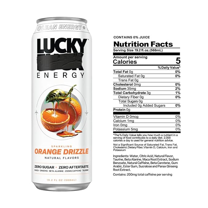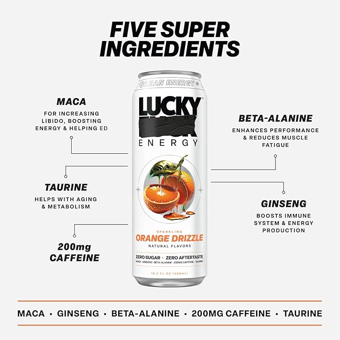 Lucky Energy Sugar Free Energy Drinks 19.2 Fl Oz Cans (Pack of 12) Healthy Energy Drink. Orange Drizzle with Maca, Ginseng, Taurine, Beta-Alanine, 200mg Caffeine (Packaging May Vary)