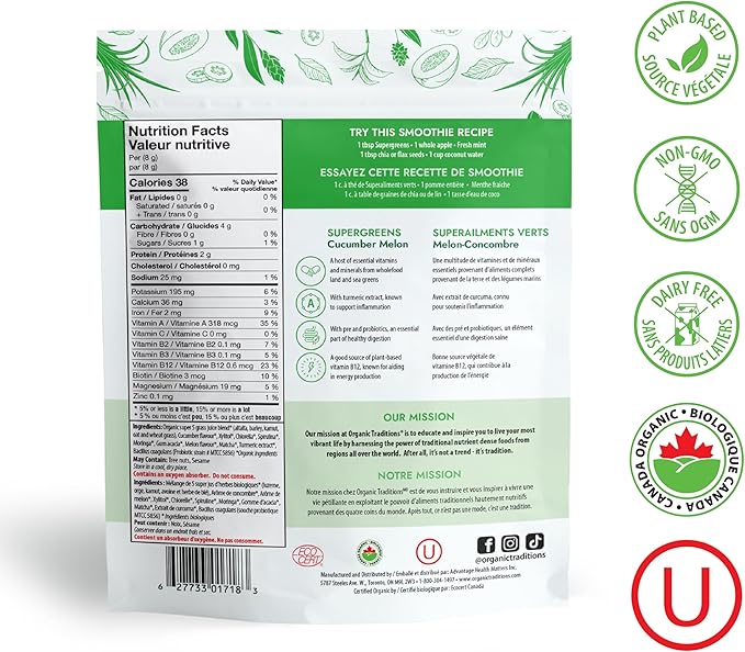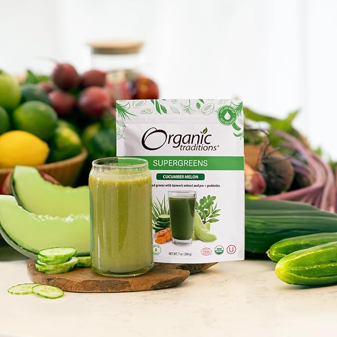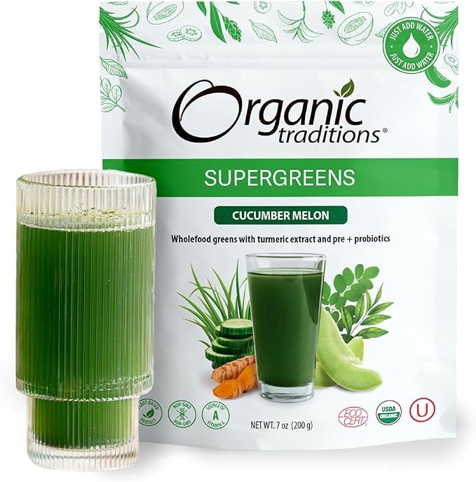 Organic Traditions Super Greens Powder Superfood with Turmeric, Cucumber Melon Flavored Organic Greens Superfood Powder, 200g / 7oz Bag