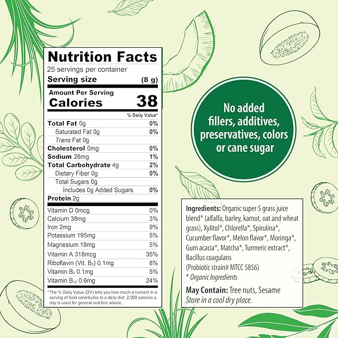 - 💚 GREEN POWER! An organic green superfood blend of alfalfa grass juice powder, barley grass juice powder, wheat grass juice powder, Kamut grass juice powder, and oat grass juice powder
