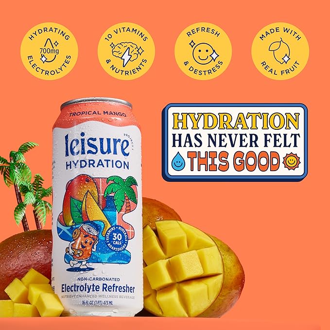 Leisure Hydration Non-Carbonated Electrolyte Refresher, Tropical Mango Flavor - Low Sugar Nutrient Enhanced Water Beverage - Get The Best Hydration Packed w/ Magnesium & Ashwagandha For Mood & Stress Support, Non-GMO, 16 oz (12-Cans)