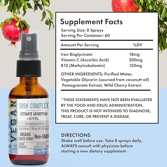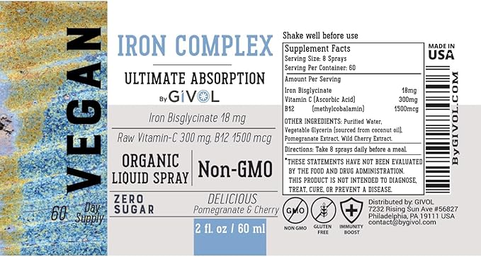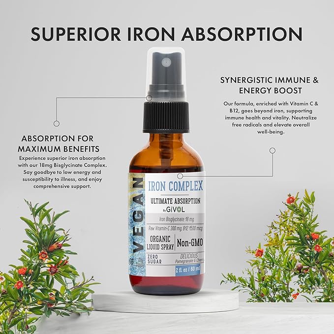 - ADVANCED ABSORPTION FOR MAXIMUM BENEFITS: Our GIVOL Iron Supplement is meticulously crafted with an 18mg Bisglycinate Complex, a superior form of iron known for its exceptional absorption rates. Take 8 sprays sublingually, daily, for maximum absorption and effectiveness. This ensures that your body can efficiently utilize the iron, providing comprehensive support for energy metabolism and immune system function. Say goodbye to low energy levels and susceptibility to illness with our advanced absorption formula.