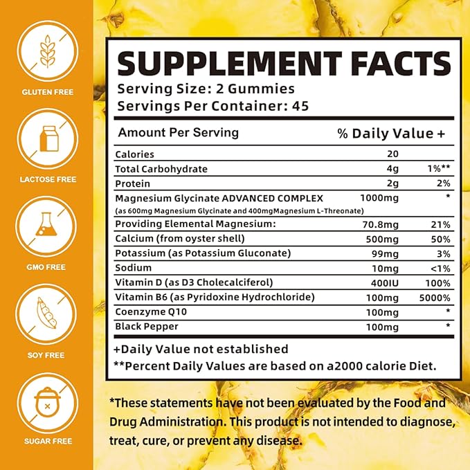 Magnesium Glycinate Gummies 1000mg with Magnesium L-Threonate,Chelated Magnesium Potassium Complex Supplement with VitD, B6, CoQ10, Calcium,Supports for Memory, Calm, Mood - 90 Mango pineapple Gummies