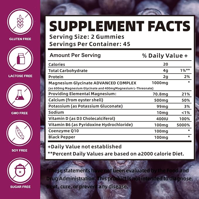 - Powerful House - Our Magnesium Gummies Contain Magnesium Glycinate 1000mg, , Vitamins D, B6, Calcium, Potassium, etc. Added Vitamin B6 help magnesium work better, Coenzyme Q10 and potassium help support the mind system and improve Memory and inattention, Vitamin D promotes the absorption of calcium