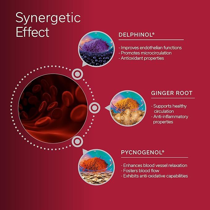 - Superfruit Antioxidant Powerhouse: Daily Circulation features Maqui Berry (Delphinol), Ginger Extract, and French Maritime Pine Bark (Pycnogenol), delivering a potent dose of antioxidants to support overall vascular health. Maqui Berry is rich in delphinidins that help neutralize free radicals and support endothelial function. Ginger Extract helps maintain circulation and metabolic balance, while Pycnogenol supports healthy nitric oxide production and promotes circulatory health.