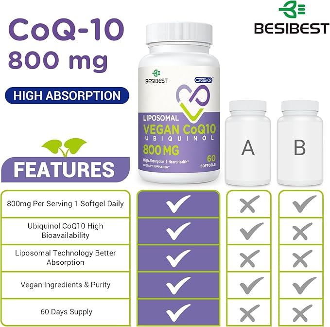 - 3X BETTER ABSORPTION: Besibest CoQ10 800 mg contains highly bioavailable--Ubiquinol, this reduced form of co q10 supplement has a 3-4X better absorption rate in the body compared to Ubiquinone coq10 supplement
