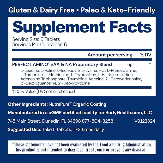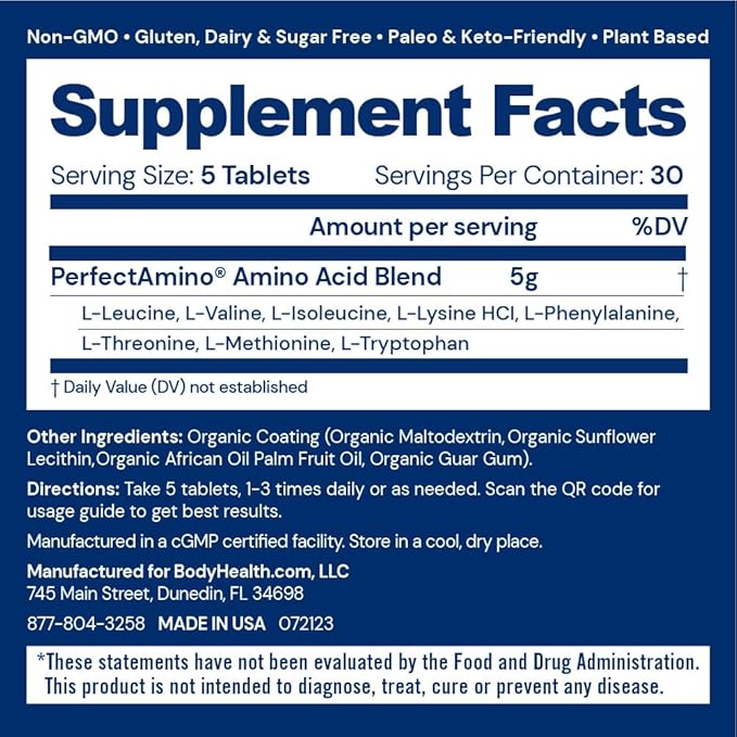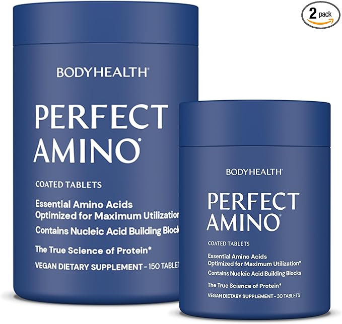 BodyHealth PerfectAmino Easy to Swallow Tablets, Essential Amino Acids Supplement with BCAAs, Vegan Protein for Pre/Post Workout & Muscle Recovery with Lysine, Tryptophan, Leucine (36 Servings)