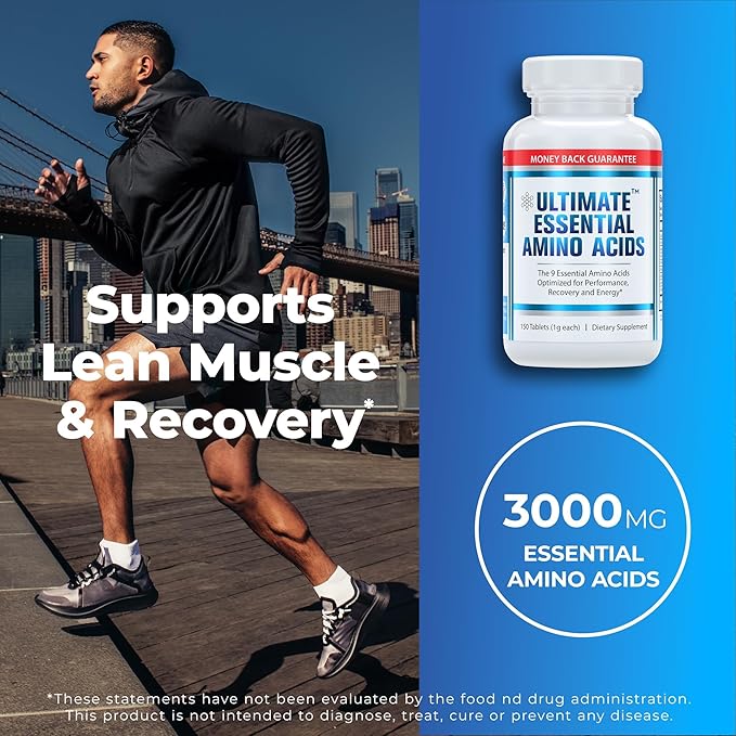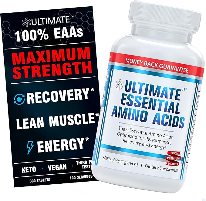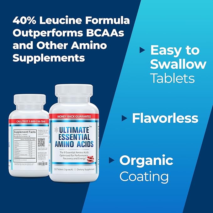 Ultimate 100% Essential Amino Acid Supplement - 3rd Party Tested - 300 Easy-to-Swallow, 1g Coated Tablets - All 9 EAA with 40% Leucine in Optimized BCAA Ratio - Improve Fitness & Performance - Non-GMO