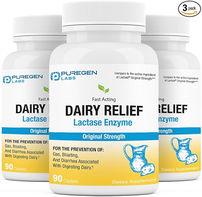 Puregen Labs Dairy Relief Natural Fast Acting Lactase Enzyme 3000 FCC, Lactose Intolerance Pills | 3 Pack - 270 Caplets Total
