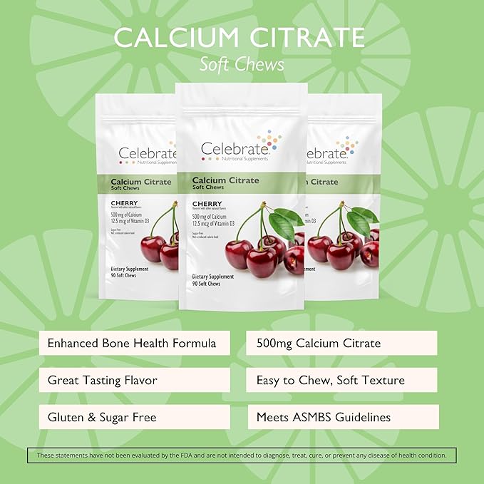 - Premium Calcium & Vitamin D Boost: Each bariatric calcium citrate soft chew provides 500mg of Calcium Citrate and 500 IU of Vitamin D3 to aid in calcium absorption and bone health - both essential nutrients for post bariatric surgery patients