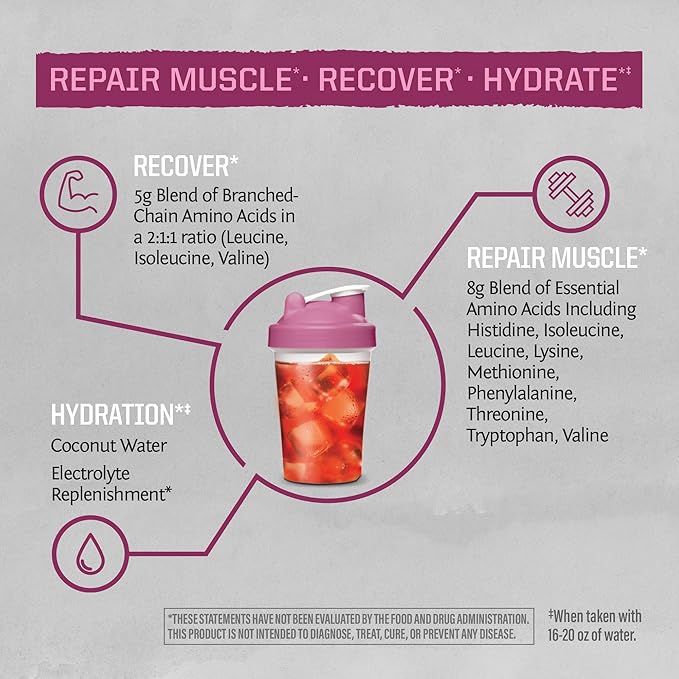 - Powerfully driven by 5 grams of branched chain amino acids in the critical 2:1:1 ratio (L-leucine, L-isoleucine, & L-valine), and 8 grams of EAAs Supports Muscle Net Balance & Muscle Recovery Optimize & Maximize Overall Muscle Repair Aids in Optimal Hydration Fast acting