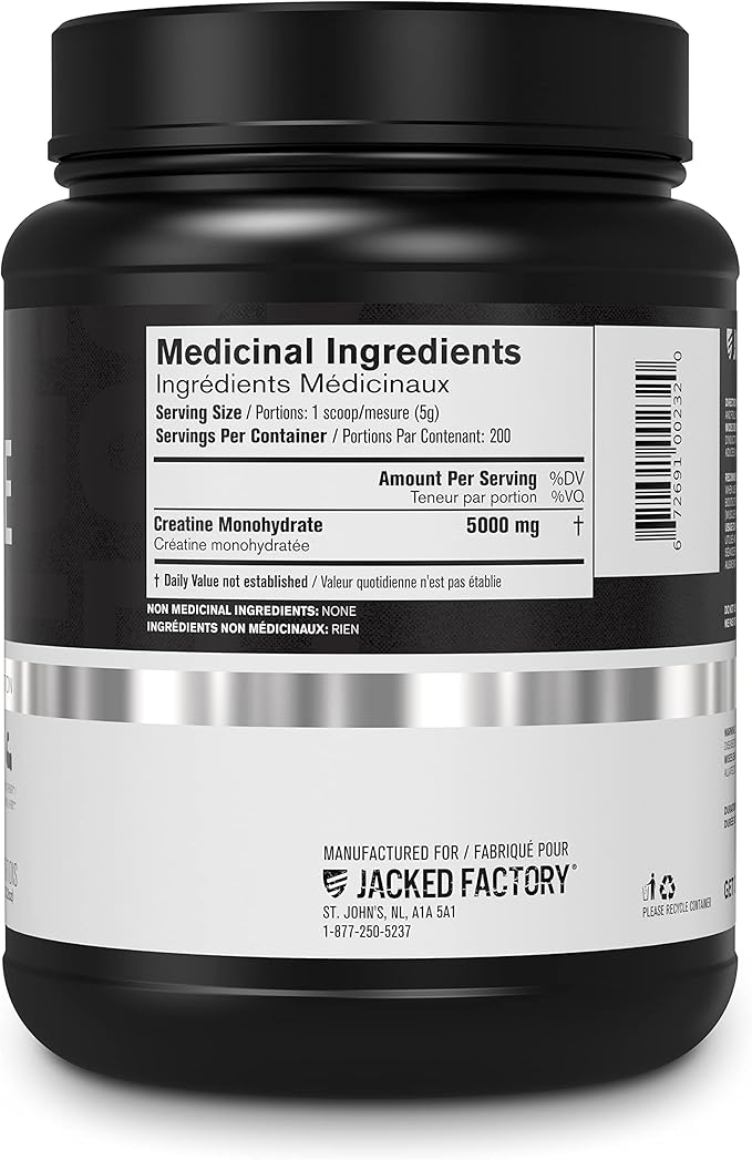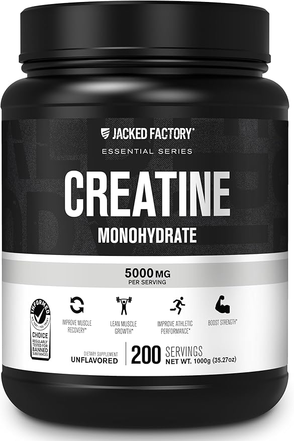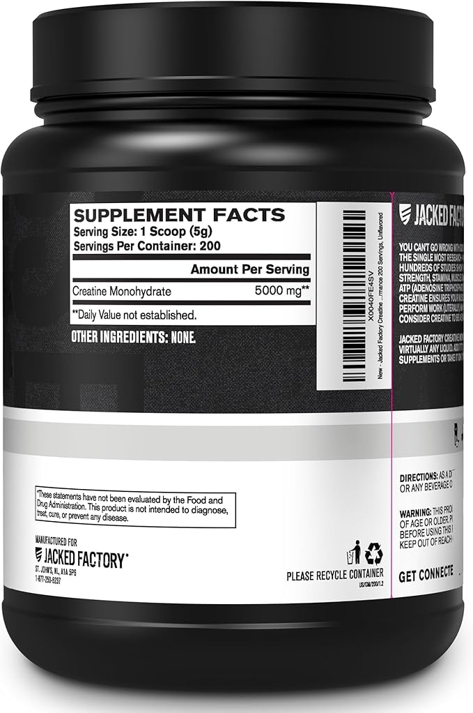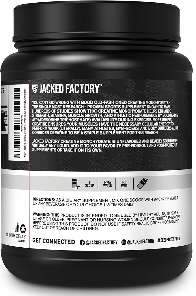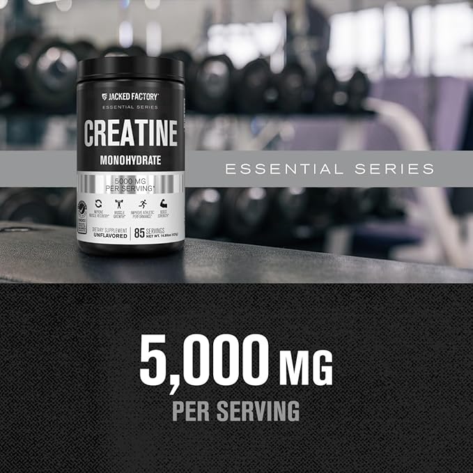 - Pure Creatine Monohydrate Powder for Pre or Post Workout: Jacked Factory Creatine Monohydrate powder features 5000mg of unflavored, pure creatine monohydrate in every scoop. Our creatine powder mixes easily in virtually any liquid and can be stacked with your favorite fitness supplements, such as pre-workout and BCAAs.