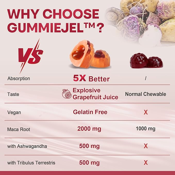 - 【Liquid Filled Technology & Sugar Free】 GummieJel gummie filling technology incorporates temperature- or pH-sensitive, lipophilic botanical extracts into gummies to make nutrients more easily absorbed. This pectin-based maca gummy has organic grapefruit flavor and is free from GMOs, dairy, soy, binders and yeast.