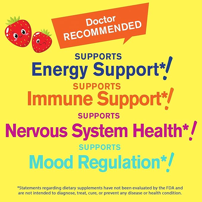 - Provides essential B vitamins for kids, including Niacin (20mg), Vitamin C (15mg), Pantothenic Acid (5mg), Vitamin B6 (2mg), Folic Acid (400mcg), Biotin (75mcg), and Vitamin B12 (30mcg) for optimal growth and development.