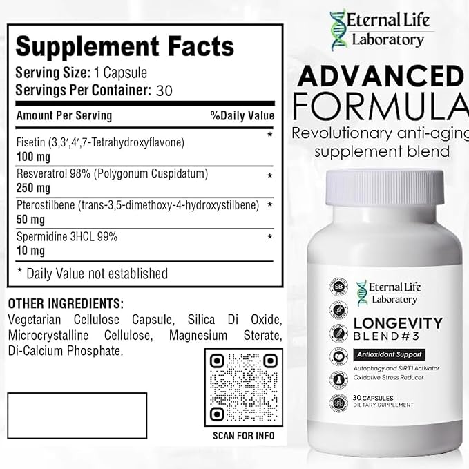 Longevity Blend #3 - Resveratrol 98% with Fisetin Pterostilbene Spermidine, Anti Aging, Oxidative Stress Reducer, Antioxidant Supplement, AMPK Activator