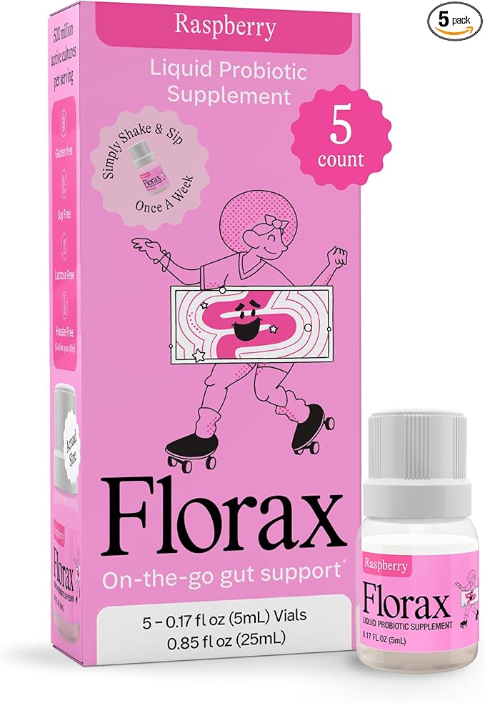 Florax - Liquid Probiotic - On-The-go Gut Support for Women, Men, and Children - Vegan, Gluten Free, Lactose Free, Soy Free and Preservative Free - Raspberry Flavor - 5 Vials