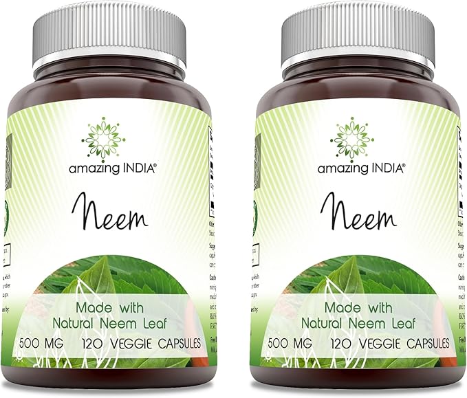 Amazing India Neem (Made with Natural Neem Leaf) 500 mg Veggie Capsules Supplement | Non-GMO | Gluten Free | Made in USA | Suitable for Vegetarians (120 | 2 Pack)