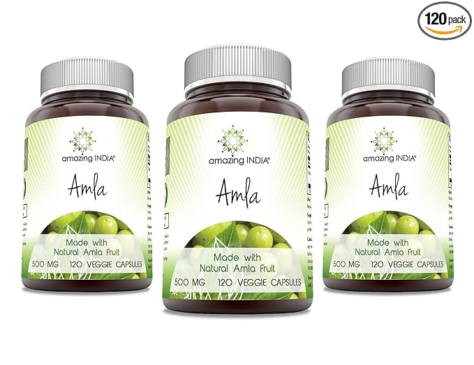 Amazing India Natural Amla 500 mg Per Serving Veggie Capsules Supplement | Non-GMO | Gluten Free | Ideal for Vegetarians | 120 Count | 3 Pack