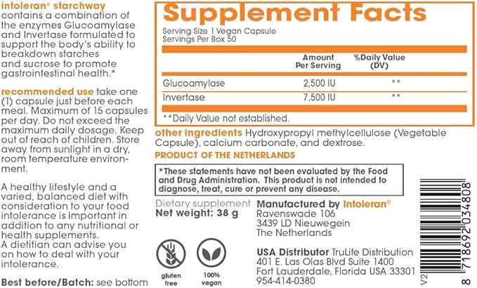 - DIGESTIVE ENZYMES - Intoleran Starchway contains a combination of the enzymes Glucoamylase and Invertase formulated to support the body’s ability to breakdown starches and sucrose to promote gastrointestinal health.