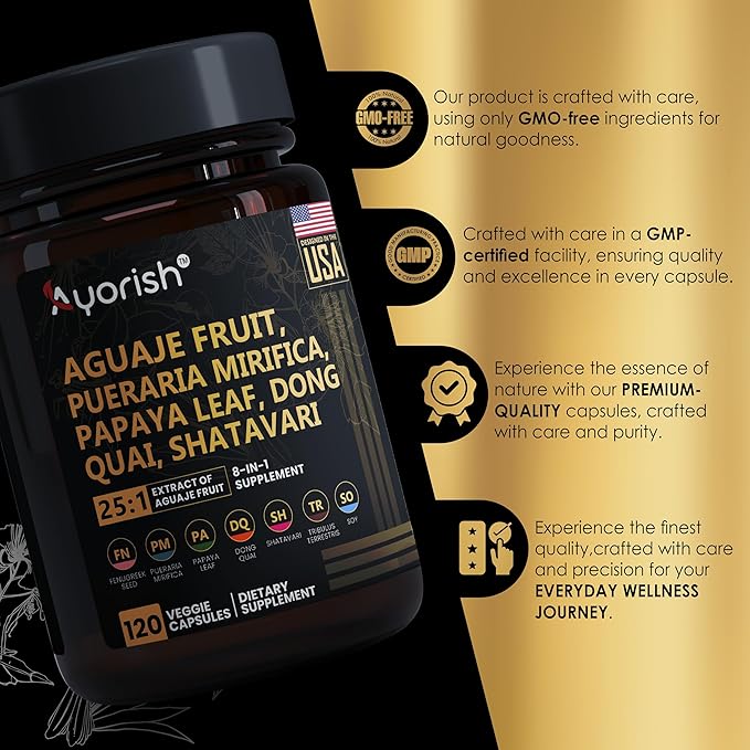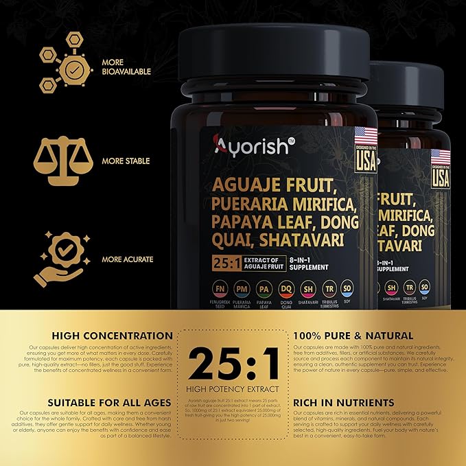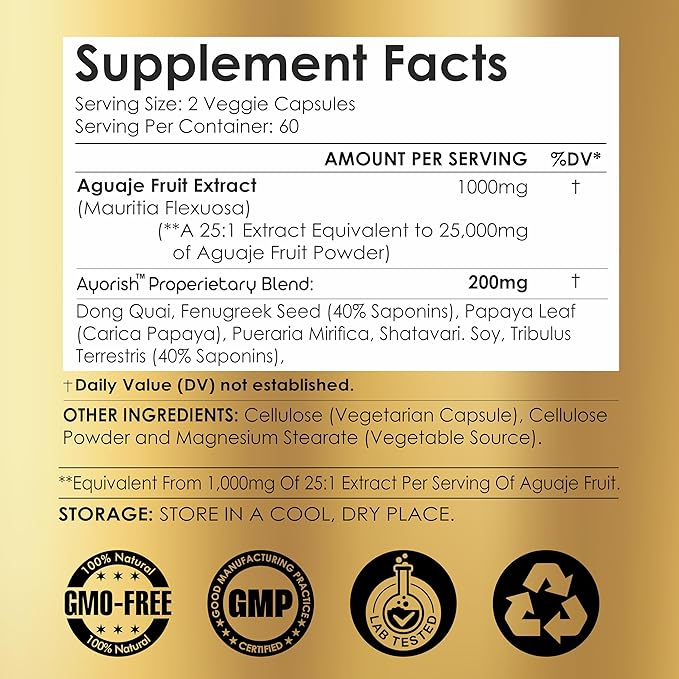 - Enriched with a Unique Proprietary Blend-Elevate your health with our unique proprietary blend, featuring Dong Quai, Fenugreek, Pueraria mirifica, and Papaya Leaf. These added ingredients complement the Aguaje Extract, enhancing its efficacy and providing a synergistic boost to your health. Each capsule is a powerhouse of wellness, crafted to support various aspects of your health.