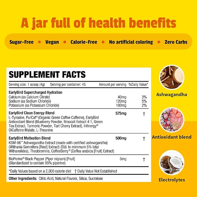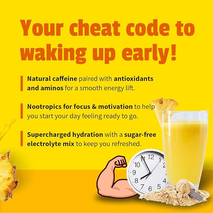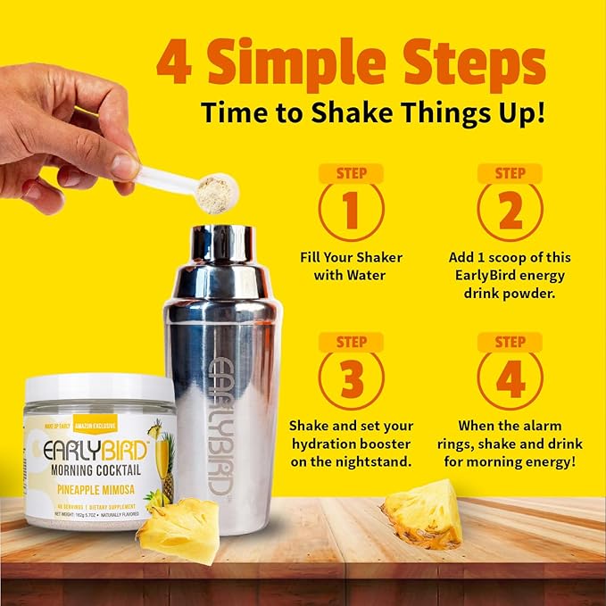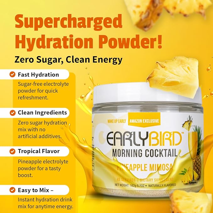EarlyBird Morning Cocktail - Pineapple Mimosa 45 Servings - Clean Energy Drink (Natural Caffeine), Increased Motivation (Nootropics), Supercharged Hydration (Electrolytes) - Wake Up Early Drink w/