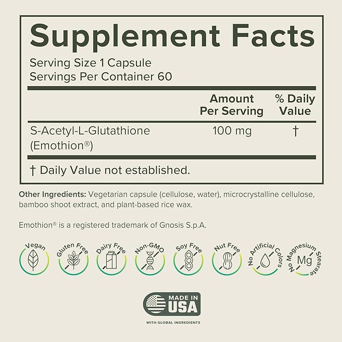 - Only the Ingredients You Want — Fortify your body from head to toe with this gluten free S-acetyl glutathione vegan supplement.* Reinforce normal liver, cognitive and immune function with a single dietary ingredient antioxidant supplement sourced from trusted vendors