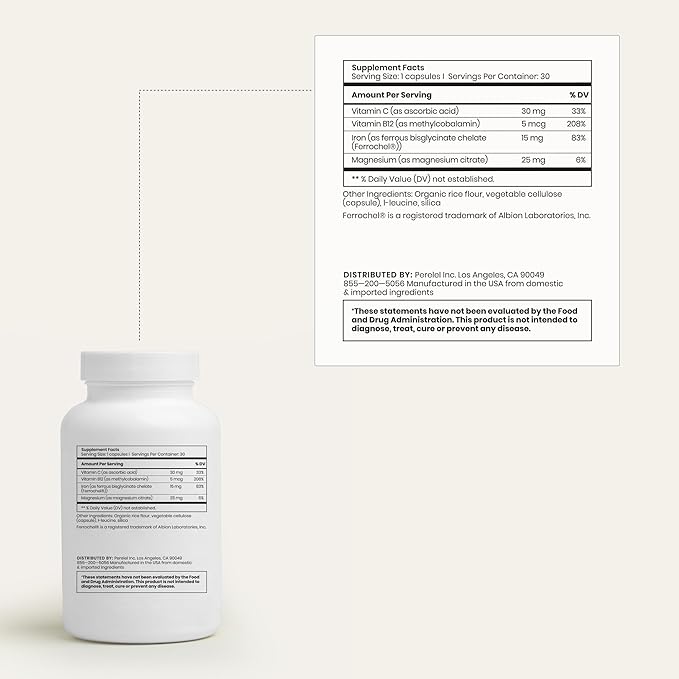 Perelel Daily Iron Ease, 15MG Iron Supplements with Magnesium, Vitamin C, & Vitamin B12 for Nutrient & Energy Support, Capsules for Women and Men, Soy, Dairy & Gluten Free, Non GMO, 30 Pills