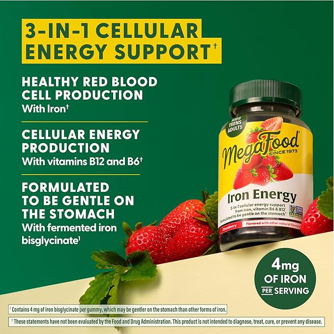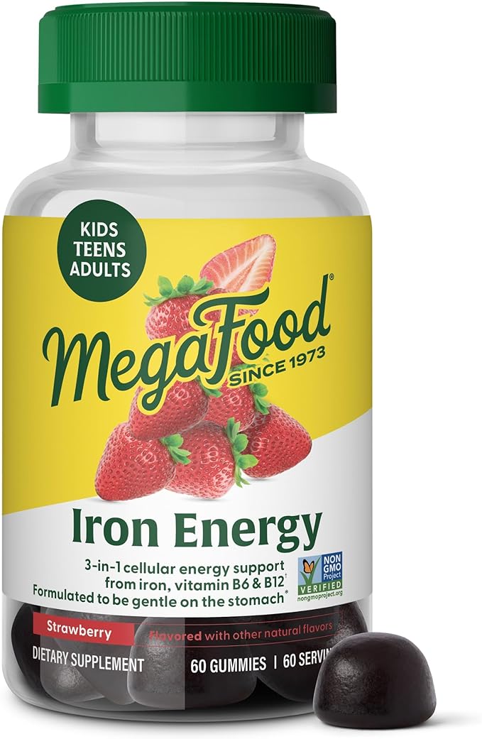 MegaFood Iron Energy Gummies, Iron Supplement for Women, Men, Teens & Kids with Vitamin B12 & B6, Vitamins, from The Makers of Blood Builder Supplement, Strawberry Flavor, 60 Count