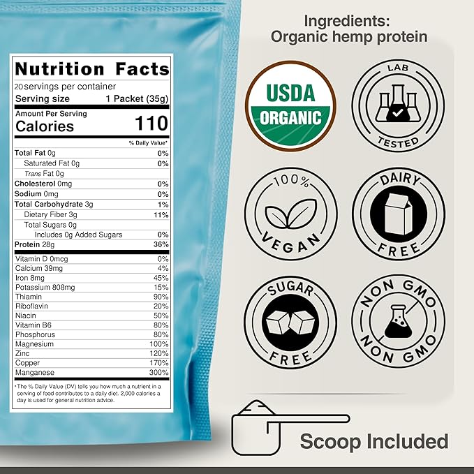 - Certified USDA Organic: Trust in the integrity of our plant-based vegan protein powder, certified USDA Organic, non-GMO, and vegan-friendly. Our straightforward label and one simple ingredient ensure transparency and quality. Protein sourced from all organic hemp seeds.