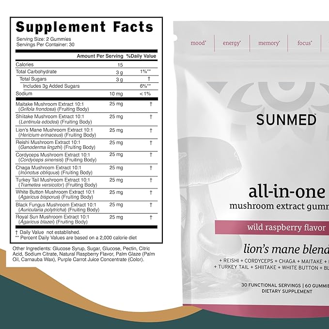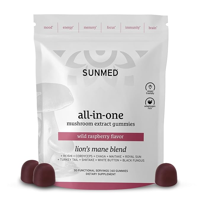 All-in-One Mushroom Gummy Supplements for Focus, Energy, Mood & Immune Support – 10 Functional Mushrooms (Lion’s Mane, Reishi, Cordyceps, Chaga) | Wild Raspberry Flavor, 60ct