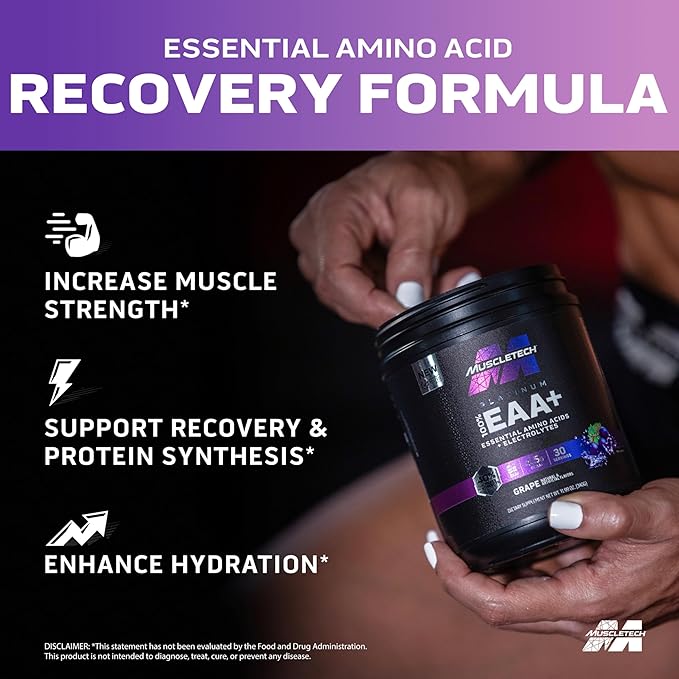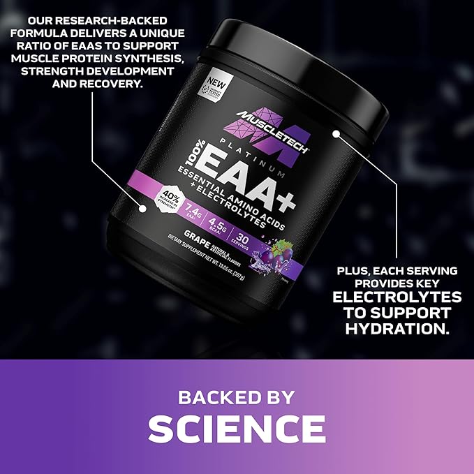 - Ultimate Recovery Backed by Science: MuscleTech Platinum 100% EAA+ is a workout essential. It delivers a unique ratio of essential amino acids (EAAs) to support muscle protein synthesis, strength development and recovery. Grape. 30 servings.
