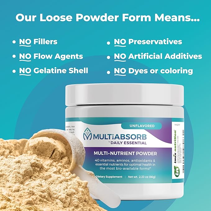 - Product Benefits : MultiAbsorb Daily Essential is a complete multi-nutrient in powder form (vitamins, trace minerals, amino acids) – which is ready to scoop and mix in the liquid of your choice. No fillers, flow agents, preservatives, or artificial anything! Sprinkle a scoop into water, juice, your protein or veggie shake or smoothie, just shake/blend and go! MultiAbsorb Daily Essential is a complete multi-nutrient in powder form (vitamins, trace minerals, amino acids) – which is ready to scoop and mix in the liquid of your choice. No fi… See more