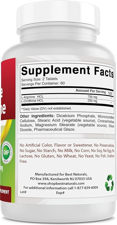 Best Naturals L-Arginine L-Ornithine - 1000mg per Serving - 120 Tablets - Non-GMO & Gluten Free (120 Count (Pack of 2))