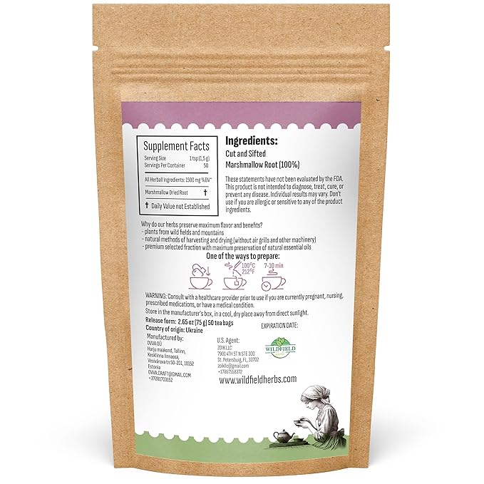 50 Bags Dried Marshmallow Root Tea Marshmallow Root Herb Herbal Tea (Althaea Officinalis) - 50 Count Bags Cut Sifted Herb Raíz De Malvavisco