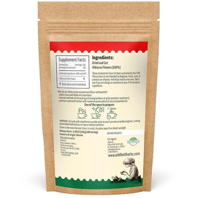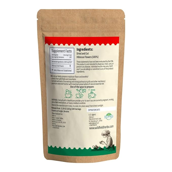 - 100 bags of Hibisko. Weight of bag: 1.5 g . These Hibiscus Flower have been grown, carefully harvested, specially dried and specially packaged to ensure that they reach the customer in the freshest and most fragrant condition.