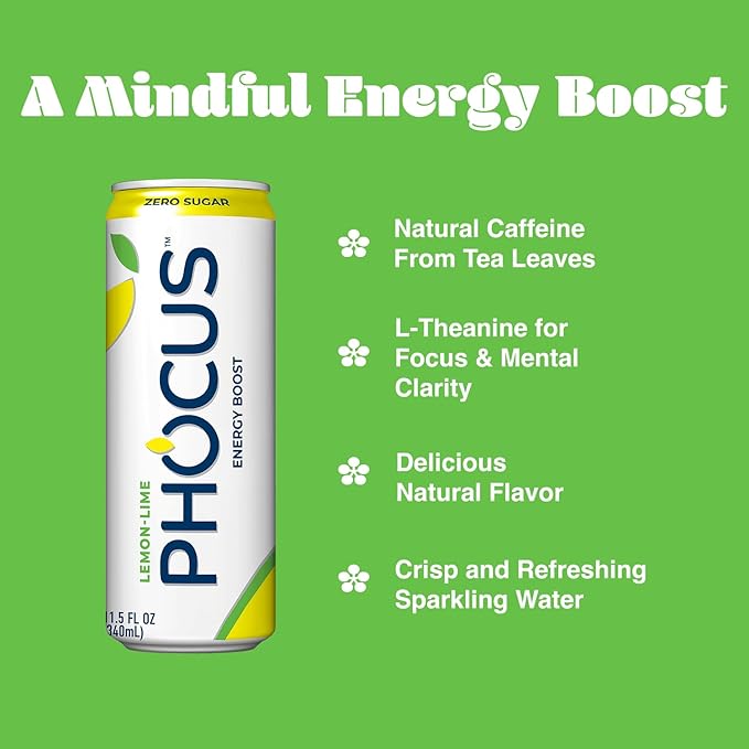PHOCUS Caffeinated Sparkling Water, Lemon Lime, 75mg Natural Caffeine Plus L-Theanine, Zero Sugar, Zero Calories, No Artificial Sweeteners, 11.5 fl oz Cans (Pack of 12)